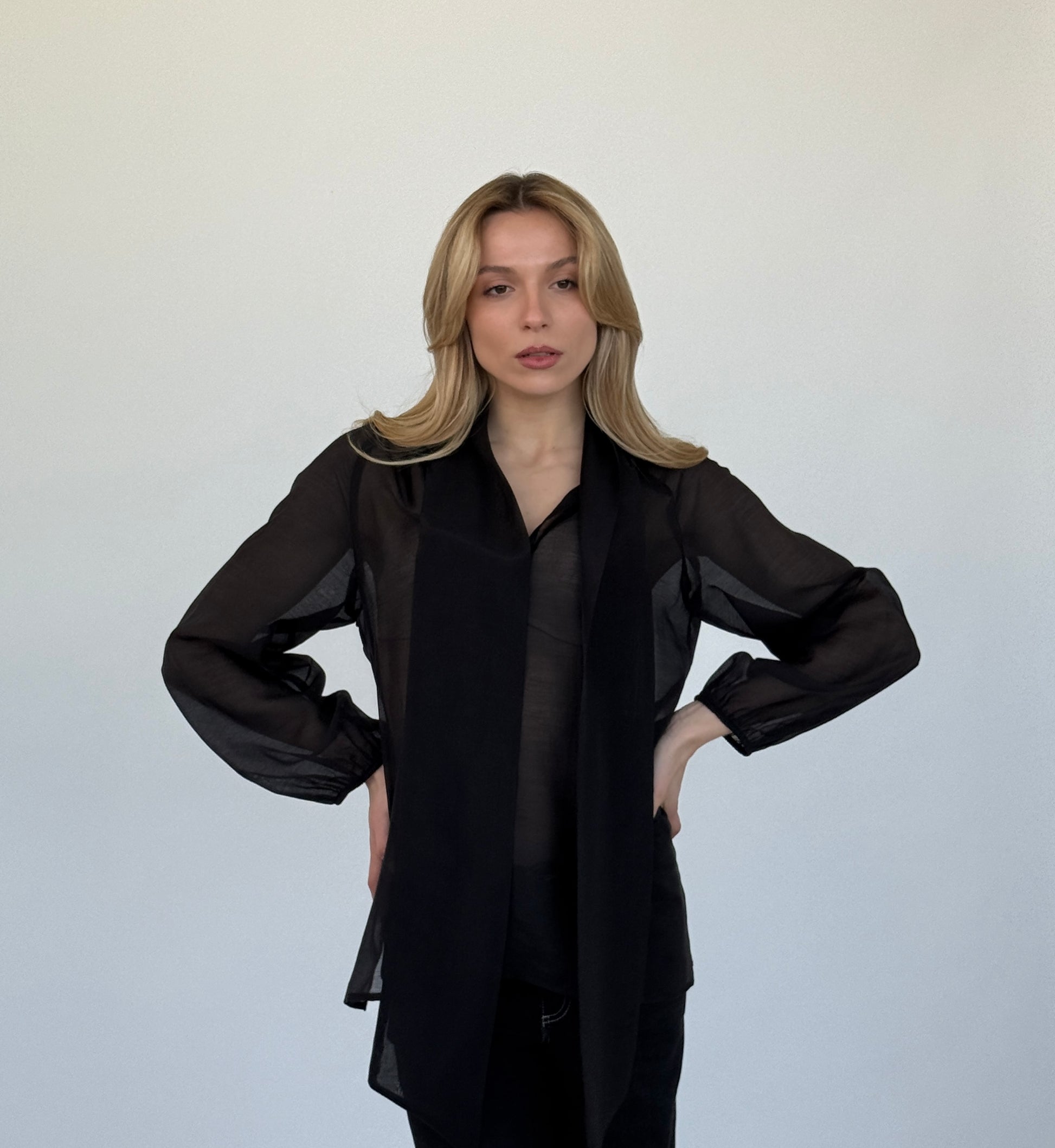 Le maniche a palloncino donano volume e movimento, mentre la leggera arricciatura sotto il collo crea una linea fluida e femminile.